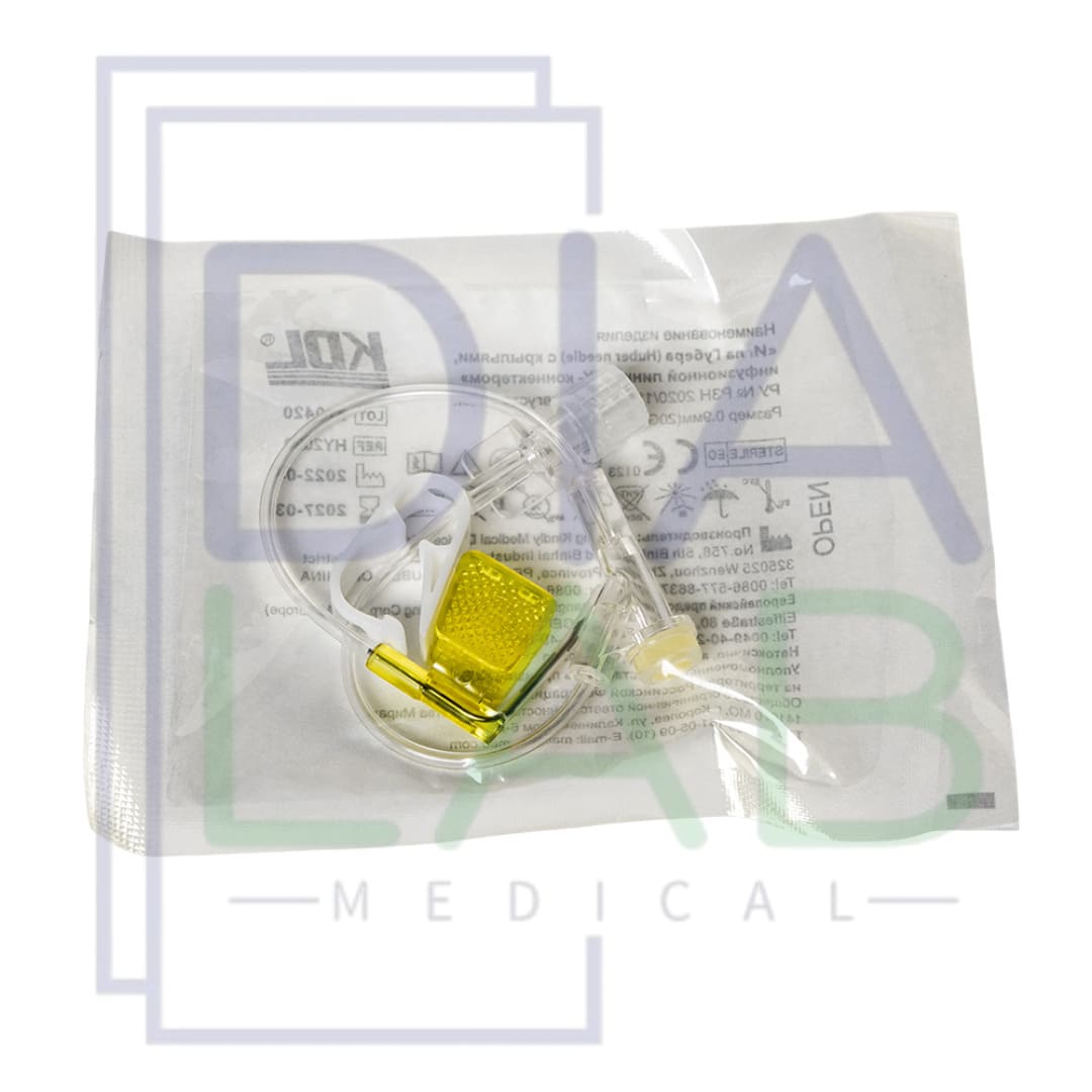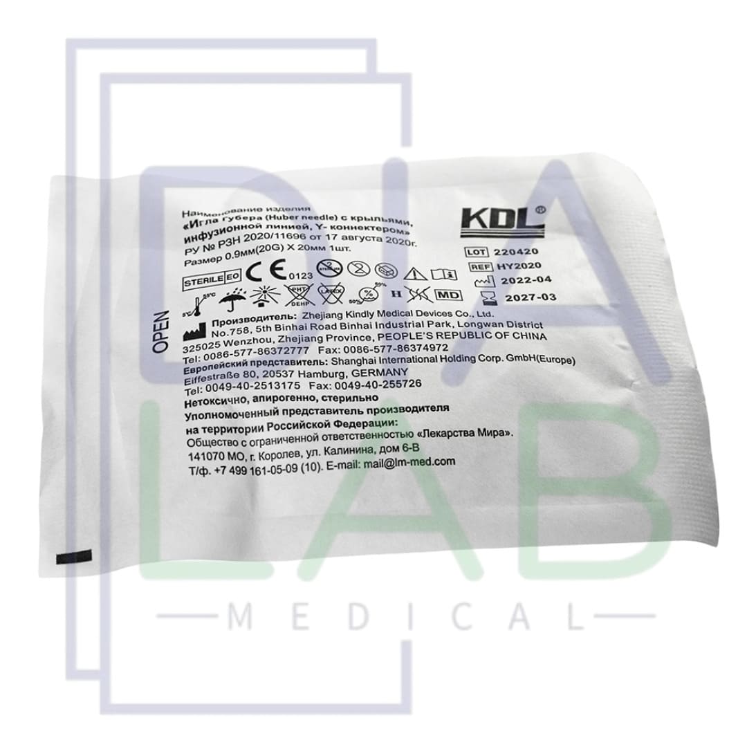 Иглы Губера одноразовые стерильные с крыльями, инфузионной линией и Y-коннектором с силиконовым клапаном от производителя KDL (Китай).