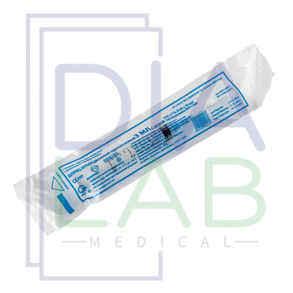 Шприц стерильный одноразовый трехкомпонентный вместимостью 3 мл с иглой (0,6х30 мм). Прозрачный цилиндр с нестираемой четкой шкалой обеспечивает контроль точности вводимого лекарственного препарата.